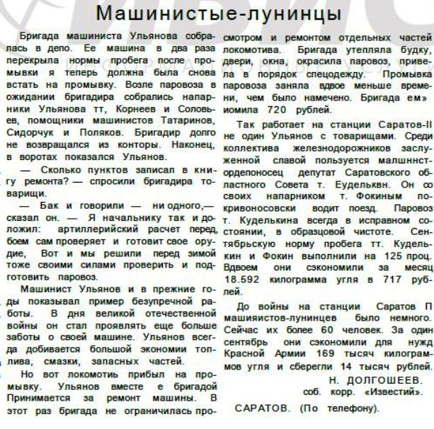 Война предъявляет повышенные требования к производительности и качеству труда. Движение идёт и сверху – постановления правительства, организация социалистического соревнования, пленумы обкомов и снизу – инициативы, почины рабочих, колхозников, интеллигенции. Собственный корреспондент «Известий» Н. Долгошеев в номере от 8 октября рассказывает о машинистах – лунинцах. Бригадир машинистов станции Саратов - II тов. Ульянов проводит аналогию подготовки паровоза к зиме по-лунински (т.е. силами самой паровозной бригады) с подготовкой самим артиллерийским расчётом орудия к бою. Машинист - орденоносец депутат Саратовского областного Совета т. Куделькин с напарником т. Фокиным по-кривоносовски (т. е. быстрее почти в полтора раза) водит поезд. До войны на станции Саратов - II машинистов - лунинцев было немного. Сейчас их более 60 человек. За один сентябрь они сэкономили для нужд Красной Армии 169 тысяч килограммов угля и сберегли 14 тысяч рублей [3].