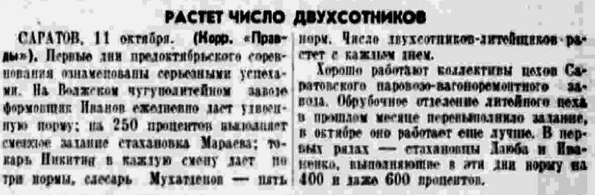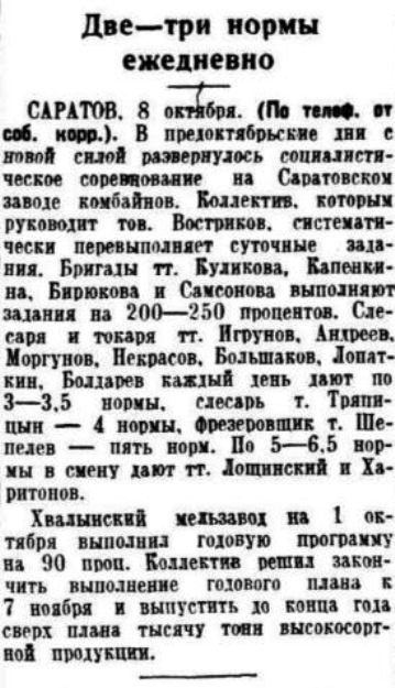 Две — три и до 6,5 норм ежедневно выполняют на Саратовском заводе комбайнов, сообщается в газете «Известия» от 9 октября. На первой странице «Правды» от 12 октября также сообщается о росте числа двухсотников [4, 6].