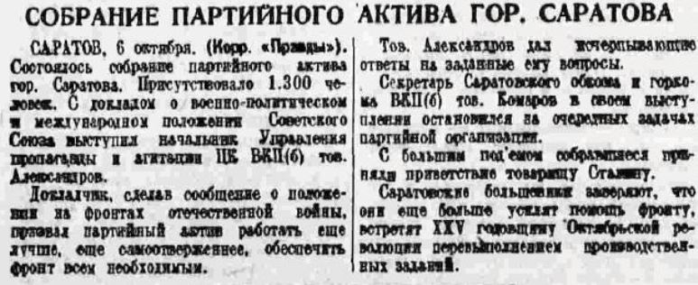 На первых страницах центральных газет от 7 октября освещено выступление начальника Управления пропаганды и агитации ЦК ВКП (б) тов. Г. Ф. Александрова на собраниях партийных активов города и саратовского гарнизона [8, 9, 10].