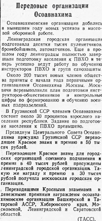 Газеты «Известия» и «Красная звезда» от 7 октября информируют читателей, что за новые успехи в массовой оборонной работе переходящими Красными знамёнами и денежными премиями награждены осоавиахимовские организации Башкирской и Татарской АССР, Хабаровского края, Московской, Ленинградской и Саратовской областей [18].