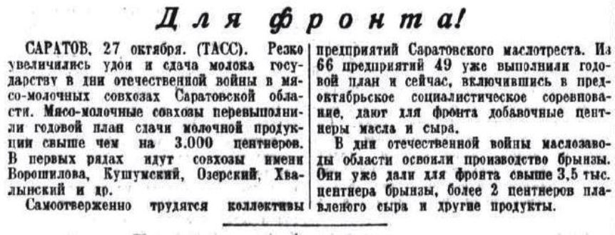 В газете «Известия» от 28 октября в заметке «Для фронта!» сообщается о перевыполнении мясо-молочными совхозами Саратовской области годового плана сдачи молочной продукции более чем на 3000 центнеров и освоении производства брынзы, что позволяет увеличить поставку продуктов на фронт [2].