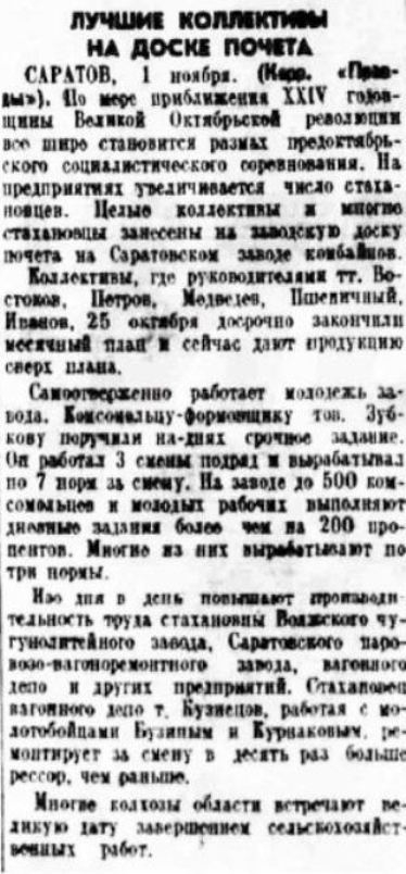 На первой странице «Правды» от 2 ноября размещена информация о том, что к XXIV годовщине Великой Октябрьской революции не только стахановцы, но и целые коллективы занесены на заводскую доску почета на Саратовском заводе комбайнов, Саратовском паровозо-вагоноремонтном заводе, вагонном депо и других предприятиях. Многие колхозы области встречают эту дату завершением сельскохозяйственных работ. [3].
