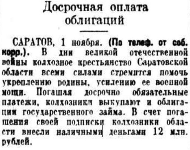 В газете «Известия» от 2 ноября сообщается, что досрочно погашают колхозники области обязательные платежи и выкупают облигации государственного займа. Внесено наличными 12 млн. рублей [4].