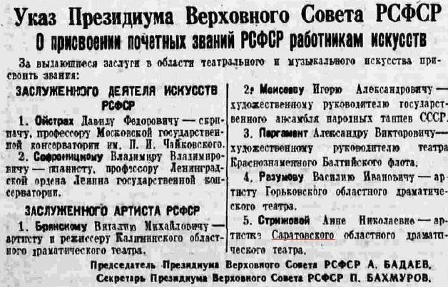 Указом Президиума Верховного Совета РСФСР за выдающиеся заслуги в области театрального и музыкального искусства Стрижовой Анне Николаевне — артистке Саратовского драматического театра - присвоено почетное звание Заслуженного артиста РСФСР. Об этом сообщается в газетах «Правда» и «Красная звезда» от 28 октября [8, 9].
