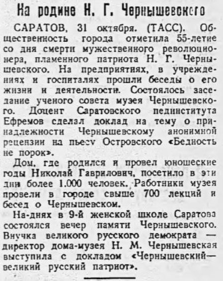 55-летию со дня смерти Н. Г. Чернышевского посвящена статья «На родине Н. Г. Чернышевского», опубликованная в «Красной звезде» от 1 ноября [16].