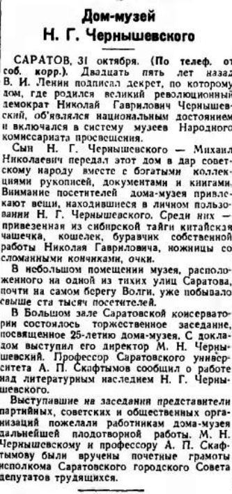 В Большом зале Саратовской консерватории состоялось торжественное заседание, посвященное 25-летию дома-музея Н. Г. Чернышевского. С докладом выступили его директор М. Н. Чернышевский и профессор Саратовского университета А. П. Скафтымов. Им были вручены почетные грамоты исполкома Саратовского городского Совета депутатов трудящихся [22].