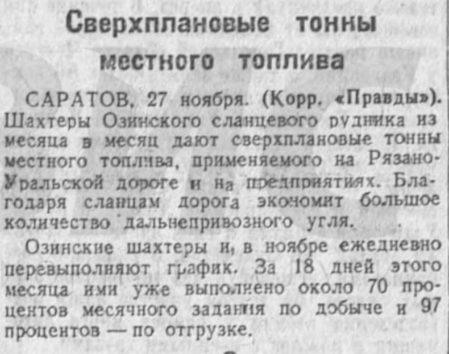28 ноября в газете «Правда» в заметке «Сверхплановые тонны местного топлива» сообщается, что «<...> шахтёры Озинского сланцевого рудника из месяца в месяц дают сверхплановые тонны местного топлива, применяемого на Рязано-Уральской дороге и на предприятиях» [17].