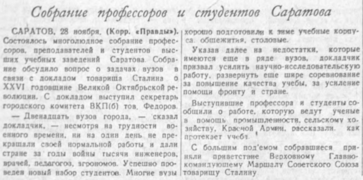 29 ноября в газете «Правда» статья «Собрание профессоров и студентов Саратова» освещает состоявшееся собрание вузовской общественности: профессоров, преподавателей и студентов высших учебных заведений Саратова. На собрании обсуждался вопрос о задачах вузов по итогам прослушанного доклада товарища Сталина. С докладом о работе двенадцати вузов города с докладом выступил секретарь городского комитета ВКП(б) тов. Фёдоров [19].