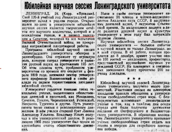 25 ноября в газете «Правда» статья «Юбилейная научная сессия Ленинградского университета» повествует о том, что очередная научная сессия ЛГУ прошла уже в родном городе. Сессия явилась своеобразным творческим отчётом научного коллектива ЛГУ. Многими докладчиками, в том числе и ректором ЛГУ, профессором Вознесенским, был отмечен огромный, поистине неоценимый вклад Саратова и Саратовского университета в непрекращавшуюся, плодотворную работу ЛГУ в период эвакуации [23].