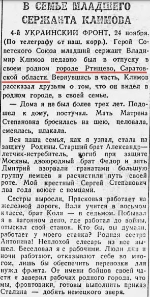 25 ноября в газете «Красная звезда» заметка «В семье младшего сержанта Климова» описывает недавний визит в отпуск в свой родной город Ртищево Саратовской области младшего сержанта Владимира Климова. Владимир более трёх лет не был дома, многое изменилось за этот период. Его родные братья самоотверженно воюют в рядах РККА, а сёстры, едва закончив школу, работают наравне со взрослыми, причём сестра Антонина заняла место Владимира у станка в вагонном депо. Климов отмечает, что из сестры вышел довольно неплохой слесарь. А в его родном городе всё подчинено одной мысли – самоотверженным трудом в тылу помочь героям-фронтовикам добить немецкого захватчика! [24].