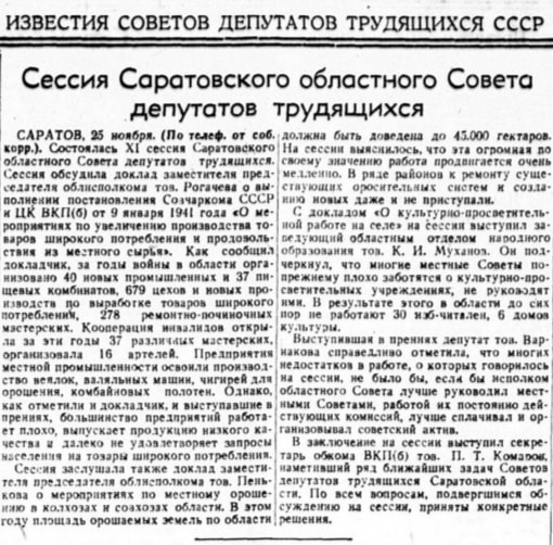 26 ноября в газете «Известия» статья «Сессия Саратовского областного Совета депутатов трудящихся» освещает вопросы поднятые на XI очередной сессии. Отмечается, что по всем обсуждаемым вопросам приняты конкретные решения. Выступавшим в заключение сессии секретарём обкома ВКП(б) товарищем П. Т. Комаровым был озвучен ряд ближайших первоочередных задач Советов депутатов трудящихся Саратовской области [25].