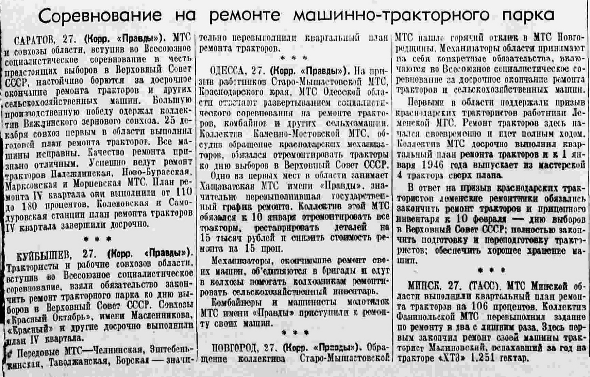 Публикация «Соревнование на ремонте машинно-транспортного парка» была помещена в газете «Правда» от 28 декабря 1945 года на пятой странице. В ней сообщается, «МТС и совхозы области, вступив в социалистическое соревнование в честь предстоящих выборов в Верховный Совет СССР, настойчиво борются за досрочное окончание ремонта тракторов и другой сельскохозяйственной техники». Корреспондент отмечает «большую производственную победу одержал коллектив Вяжлинского зернового совхоза, совхоз первым в области выполнил годовой план по ремонту тракторов. Качество ремонта отличное. Успешно ведет ремонт тракторов Надеждинская МТС, Новобурасская МТС, Марксовская МТС и другие». [107]