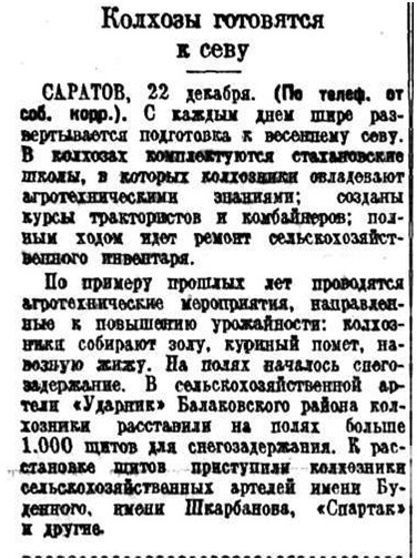 В газете «Известия» от 23 декабря 1941 года на третьей странице помещен материал корреспондента «Известия», рассказывающий о том, что в Саратовской области «с каждым днем шире развертывается подготовка к весеннему севу», корреспондент по телефону также сообщает, что «<…> на полях началось снегозадержание. В сельскохозяйственной артели «Ударник» Балаковского района колхозники расставили на полях больше 1.000 щитов для снегозадержания». Публикация называется «Колхозы готовятся к севу. Саратов». [1]