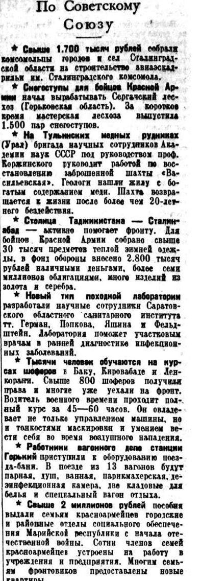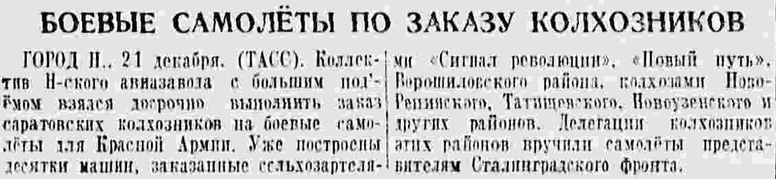 Третье сообщение — «Боевые самолёты по заказу колхозников». В нём рассказывается, что «Коллектив авиазавода взялся досрочно выполнить заказ саратовских колхозников на постройку боевых самолётов для Красной Армии. Отмечается, что построено десятки машин по заказу сельхозартелей Саратовской области. Делегации колхозников из сельхозартелей Саратовской области «Сигнал революции», «Новый путь» Ворошиловского района, колхозов Новорепинского, Татищевского, Новоузенского и других районов вручили самолеты представителям Сталинградского фронта». [25]