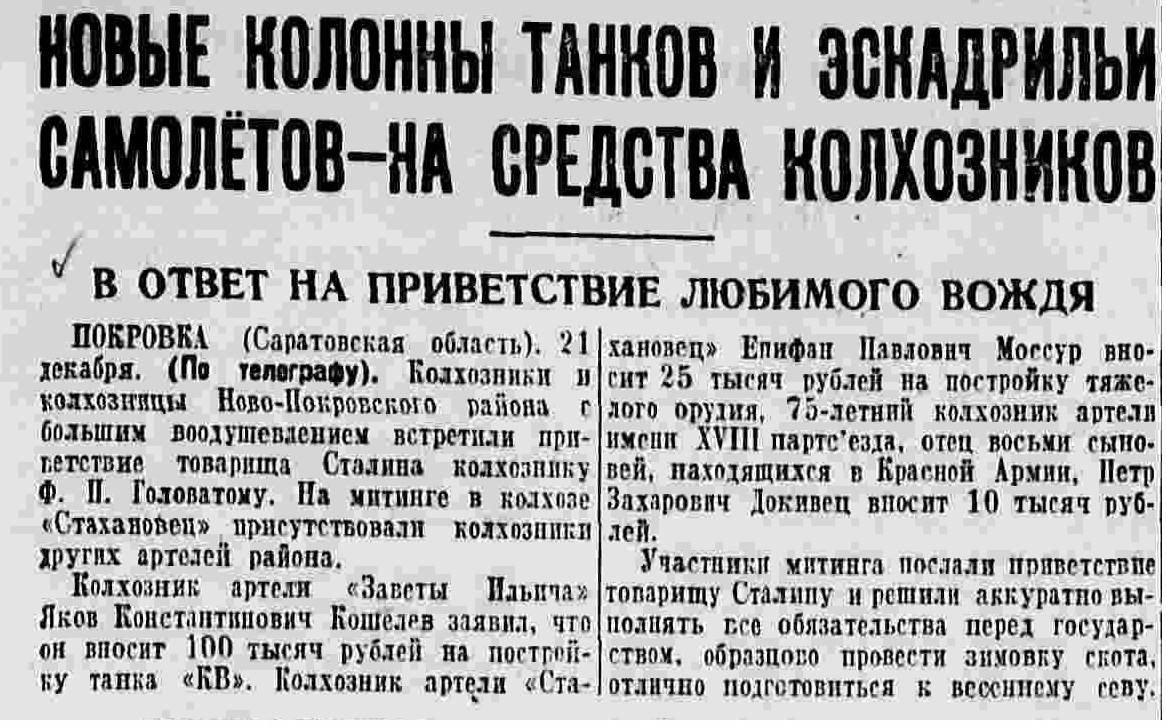 Первое сообщение «В ответ на приветствие любимого вождя». Корреспондент газеты «Правда» в сообщении, передает с митинга по телеграфу из села Покровка Саратовской области : что «колхозник артели «Заветы Ильича» Яков Константинович Кошелев заявил, что он вносит 100 тысяч рублей на постройку танка «КВ» (аббревиатура «КВ» означает «Климент Ворошилов» назван в честь военачальника К. Е. Ворошилова, впоследствии в годы войны вышла целая серия танков под этим именем), «колхозник артели «Стахановец», Епифан Павлович Моссур вносит 25 тысяч рублей на постройку тяжёлого орудия, 75-летний колхозник, многодетный отец восьми сыновей, которые находятся в действующей Красной Армии, Пётр Захарович Докивец вносит 10 тысяч рублей», «колхозники послали привет товарищу Сталину и решили аккуратно выполнять все обязательства перед государством». [23]