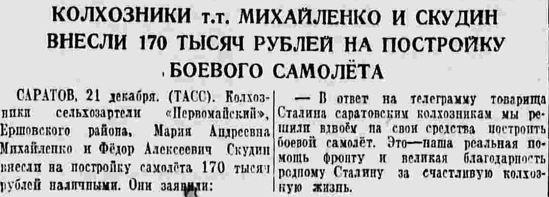 Второе сообщение: «Колхозники т.т. Михайленко и Скудин внесли 170 тысяч рублей на постройку боевого самолёта. Саратов». В сообщении рассказывается о патриотическом порыве колхозников оказывать помощь в постройке боевых самолётов для нужд фронта. В частности, в сообщении говорится : «Мария Андреевна Михайленко и Фёдор Алексеевич Скудин – колхозники сельхозартели «Первомайский» Ершовского района Саратовской области внесли на постройку боевого самолёта 170 тысяч рублей наличными. В ответ на телеграмму товарища Сталина саратовским колхозникам, мы решили вдвоём на свои средства построить боевой самолёт. Это – наша реальная помощь фронту» - заявили колхозники. [24]