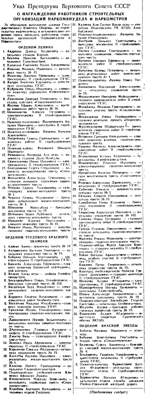 Газета «Известия» 26 декабря 1943 года разместила на второй странице правительственное постановление – Указ Президиума Верховного Совета СССР о награждении работников строительных организаций Наркомвнудела и Наркомстроя, в котором отмечается что за образцовое выполнение задания Государственного Комитета Обороны по строительству нефтепровода в исключительно короткие сроки наградить работников строительных организаций Наркомвнудела и Наркомстроя : Ялынычева Андрея Фёдоровича - заместителя секретаря Саратовского обкома ВКП (б) Орденом Трудового Красного Знамени». [88]