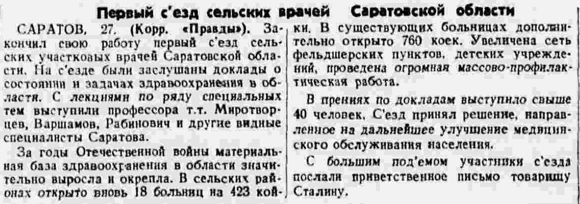 В газете «Правда» в традиционном сводном обзоре «Со всех концов страны» опубликована публикация из г. Саратова. Она называется «Первый съезд сельских врачей Саратовской области. Саратов» («Правда» от 28 декабря 1944 года). Корреспондент сообщает, что «в Саратове закончил свою работу первый съезд сельских участковых врачей Саратовской области. С лекциями на съезде по ряду тем выступили профессора, хирург Сергей Романович Миротворцев, клиницист, терапевт Лев (Левон) Александрович Варшамов, хирург И. М. Рабинович, в годы войны консультант эвакогоспиталей г. Саратова. За годы войны материальная база здравоохранения в области значительно выросла. В сельских районах были вновь открыты 18 больниц на 423 койки. В существующих больницах было открыто дополнительно 760 коек. Отмечается в сообщении, что «в прениях по докладам выступило свыше 40 человек». [99]