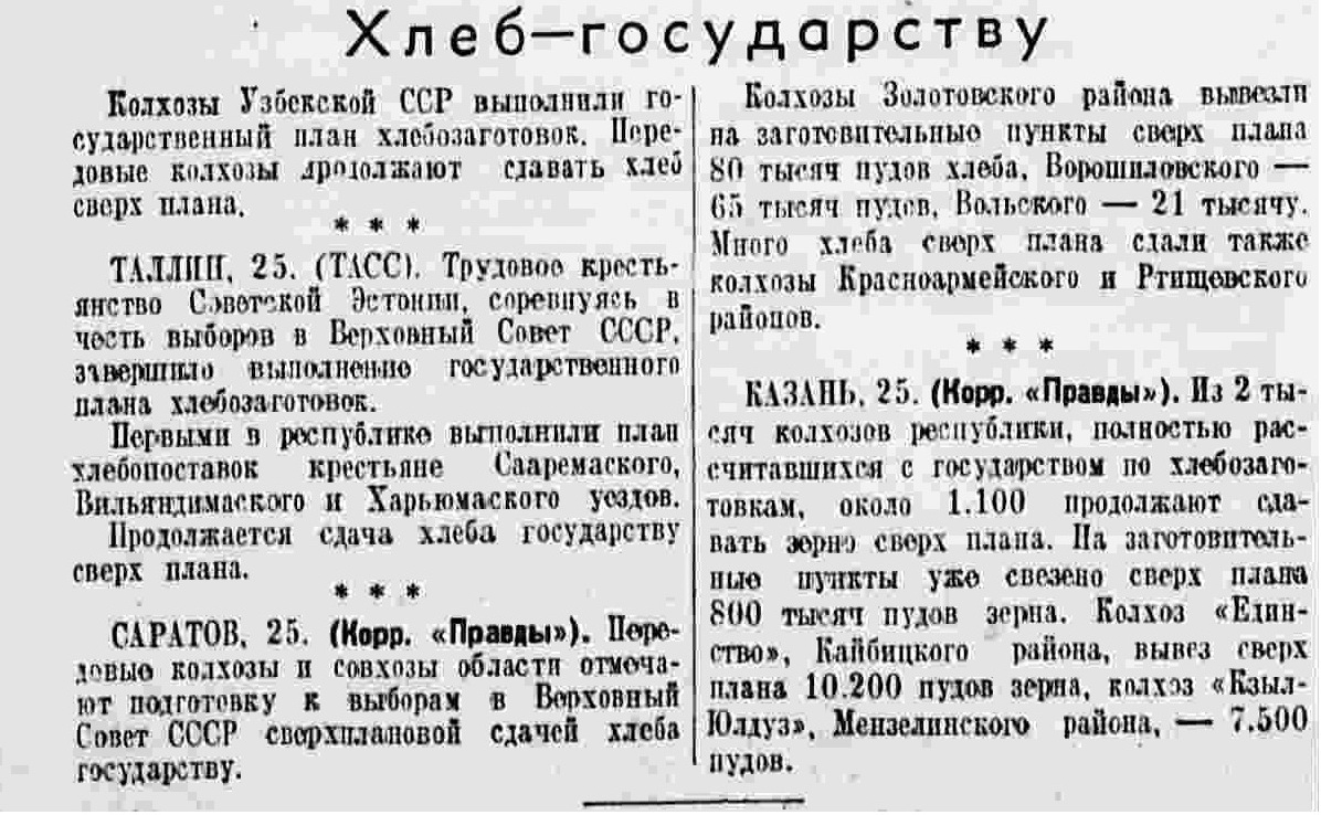 В постоянной передовице газеты «Правда» - «Хлеб – государству. Саратов» (26 декабря 1945 года, первая страница), корреспондент информирует своих читателей о том, что «передовые колхозы и совхозы Саратовской области сверхплановой сдачей хлеба государству отмечают подготовку к выборам в Верховный Совет СССР. Колхозы Золотовского района вывезли на заготовительные пункты сверх плана - 80 тысяч пудов хлеба, от Золотовского района не отстают и другие районы Саратовской области. 65 тысяч пудов хлеба сдал Ворошиловский район, 21 тысячу пудов хлеба – Вольский район. Много хлеба на заготовительные пункты сдали колхозы Красноармейского и Ртищевского районов – отмечается корреспондентом в передовице. [105]