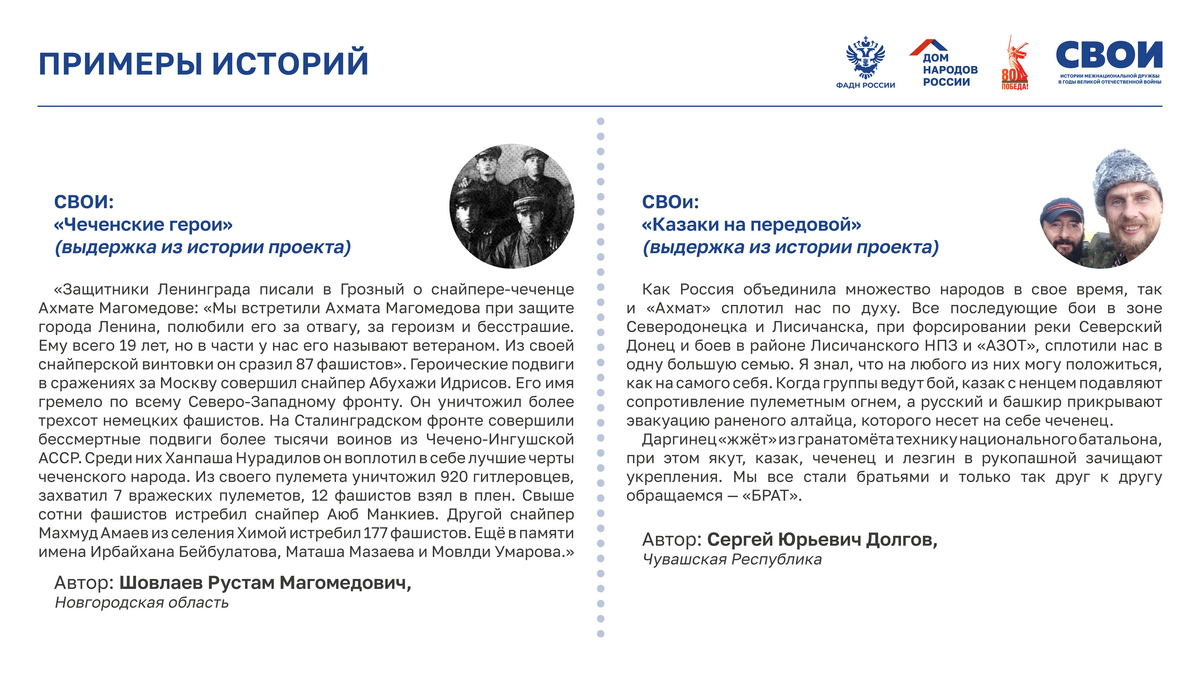 В 2025 году в рамках проекта будет издана книга «СВОИ», в которую войдут 80 самых интересных историй. В Год защитника Отечества одна из глав книги будет посвящена историям потомков победителей. Тем, кто сегодня в зоне СВО продолжают дело дедов и прадедов. Проект «СВОИ» реализуется также в формате интерактивных выставок. В этом году выставки о межнациональной дружбе в годы Великой Отечественной войны и в период СВО откроются по всей России.