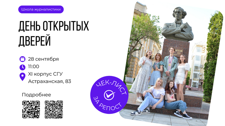Школа журналистики ИФиЖ СГУ проведёт день открытых дверей 28 сентября. Начало в 11:00 в 208 аудитории 11 корпуса СГУ. Онлайн-трансляция будет вестись в официальной группе ВКонтакте.