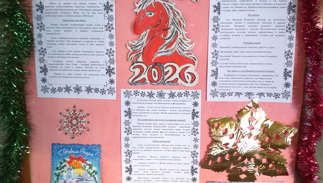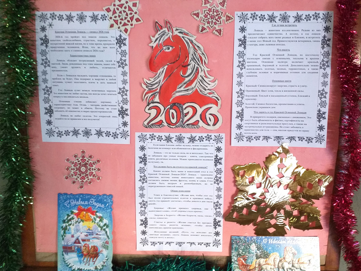 Одно из новогодних нововведений, которое возникло уже в совреиенной России — встреча Нового года в соответствии с традициями восточного календаря. Об этом можно прочитать на информационном стенде, где представлена информация о символе наступающего года — Красной Огненной Лошади.