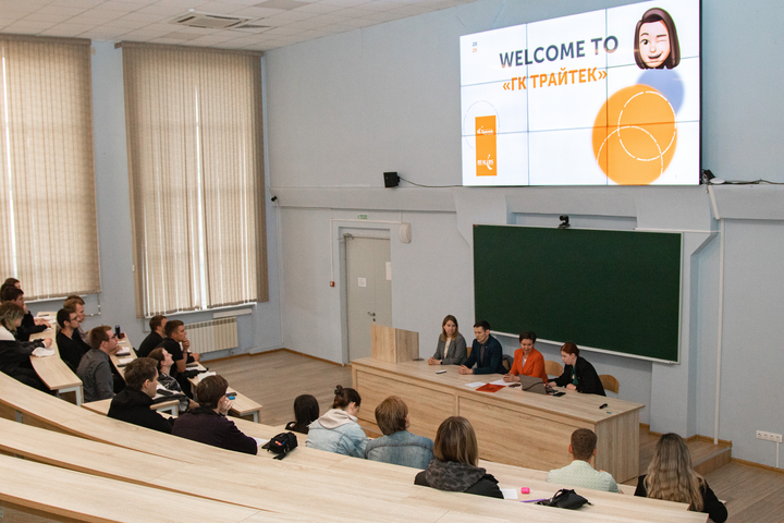 Встречу открыла заместитель директора института физики по учебной работе, доцент кафедры физики открытых систем Асель Адилова. Она познакомила участников мероприятия с гостями – представителями ГК «Трайтек». Во встречи приняли участие заместитель генерального директора по персоналу Марина Истомина, Системный архитектор Сергей Рыбаков, Консультант-аналитик 1С Вероника Жулидова.