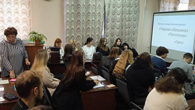 В читальном зале гуманитарных наук отраслевого учебного отдела общественных и педагогических наук ЗНБ СГУ (ул. Заулошнова, д. 3) занятие по учебной дисциплине «Введение в специальность» провела доцент кафедры русской филологии на базе МОУ «ГЭЛ» Лариса Владимировна Зимина. Она познакомила студентов-филологов очного отделения факультета ГДРиИЯ с творчеством Захара Прилепина – российского писателя, нашего современника, участника специальной военной операции.