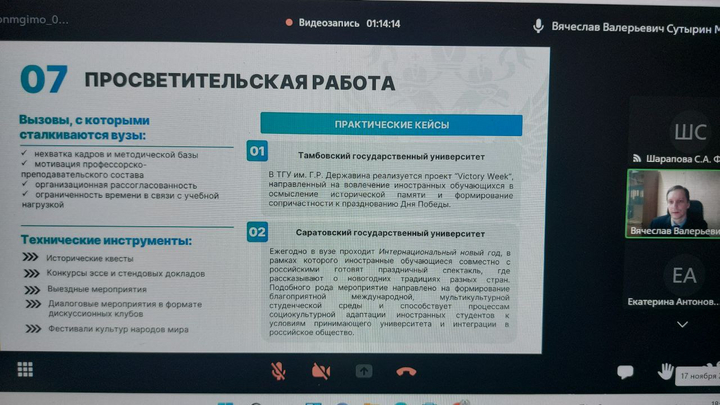 В течение пяти дней участники курса погружались в изучение актуальных методических рекомендаций, охватывающих ключевые аспекты работы с иностранными студентами. Программа включала в себя такие важные темы, как эффективные механизмы адаптации и преодоление языкового барьера и культурного шока; управление средой общежития и создание дружелюбного кампуса для иностранных студентов; построение экосистемы студенческих объединений; формирование системы вовлечения в молодежную политику иностранных обучающихся; эффективные модели наставничества; проектирование просветительских форматов.