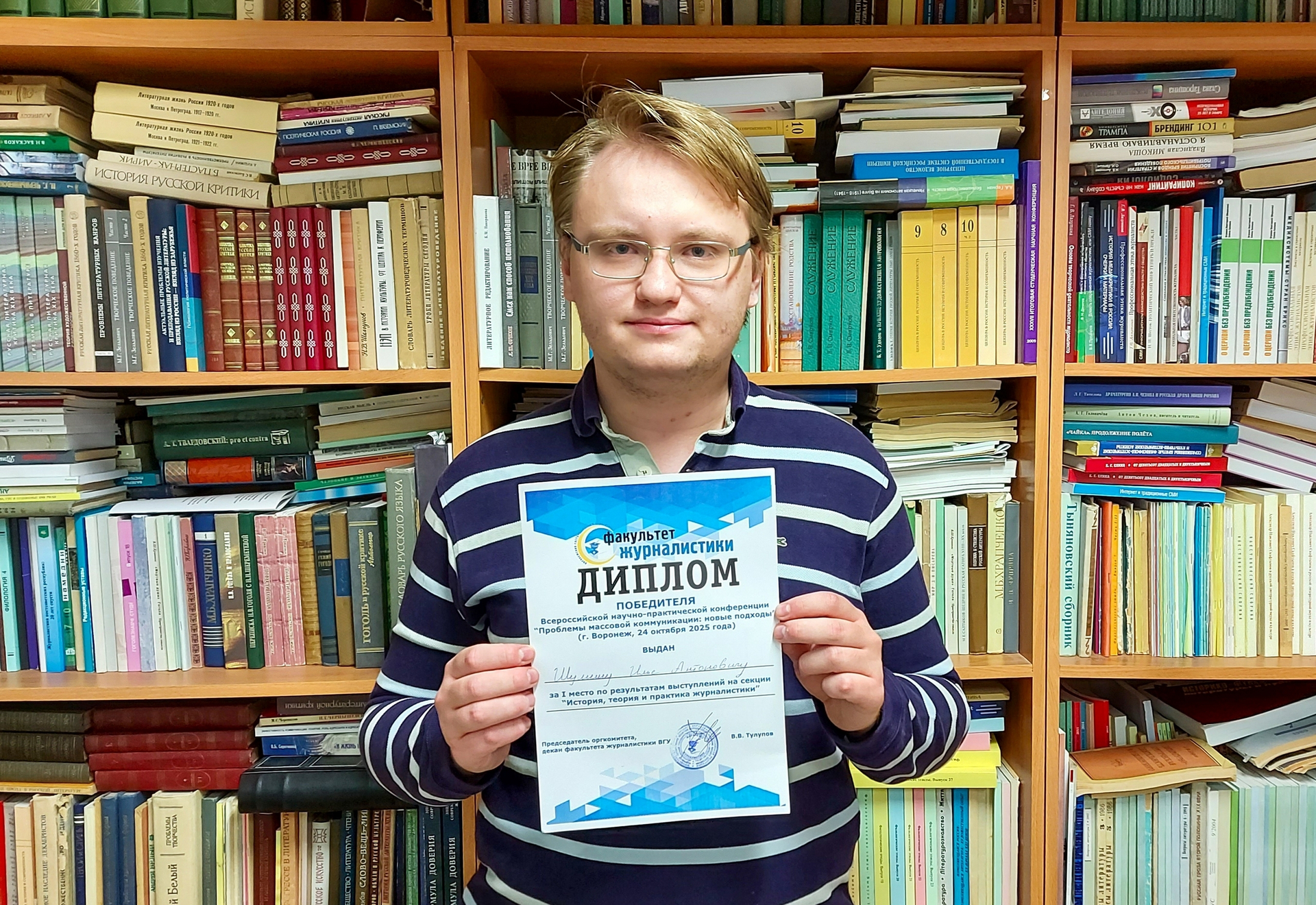 Магистрант направления «Филология» Илья Шумин получил диплом победителя на Всероссийской научно-практической конференции «Проблемы массовой коммуникации: новые подходы», которая прошла на факультете журналистики Воронежского государственного университета 24 октября.