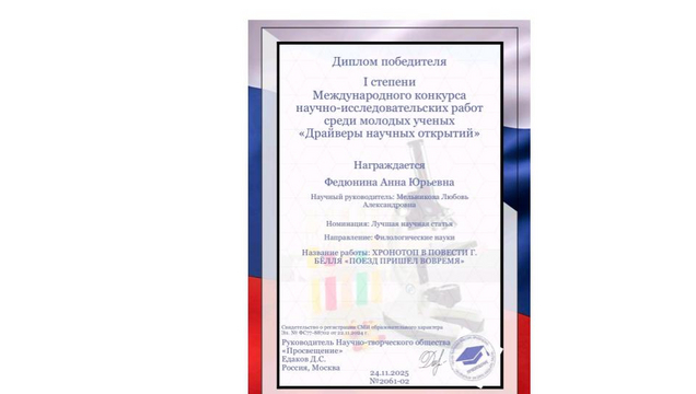 Подведены итоги Международного конкурса научно-исследовательских работ среди молодых ученых «Драйверы научных открытий», проходившего в октябре-ноябре 2025 года в г. Москве под эгидой научно-творческого общества «Просвещение». На конкурс было продано около 100 работ из различных регионов России. По его итогам в номинации «Лучшая научная статья» работа студентки 3 курса профилей «Русский язык. Литература» Анны Федюниной на тему «Хронотоп в повести Г. Бëлля «Поезд пришел вовремя» (научный руководитель – доцент кафедры филологических дисциплин Л. А. Мельникова) отмечена дипломом I степени.