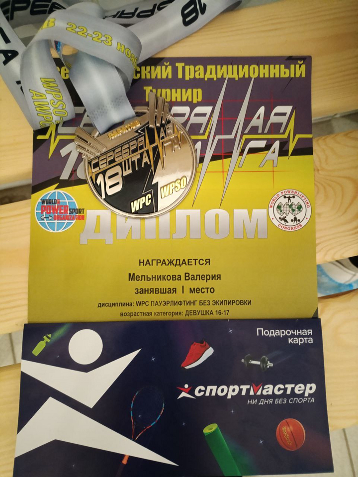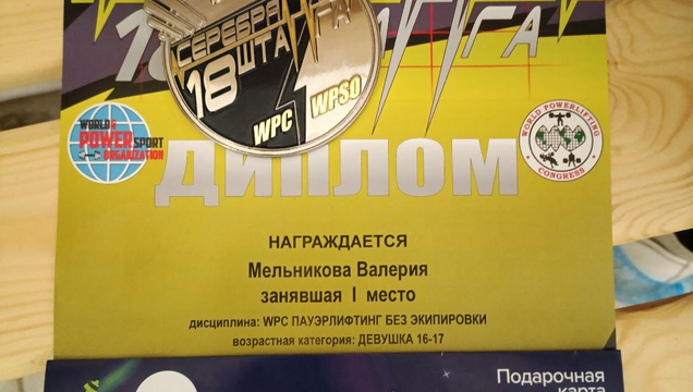 Валерия Мельникова приняла участие в номинации WPC пауэрлифтинг без экипировки в весовой категории до 56 кг. Девушка собрала сумму трёх движений 192,5кг и стала победительницей! Спортсменка тренируется под руководством тренера Александра Борисовича Роде в спортклубе СГУ.