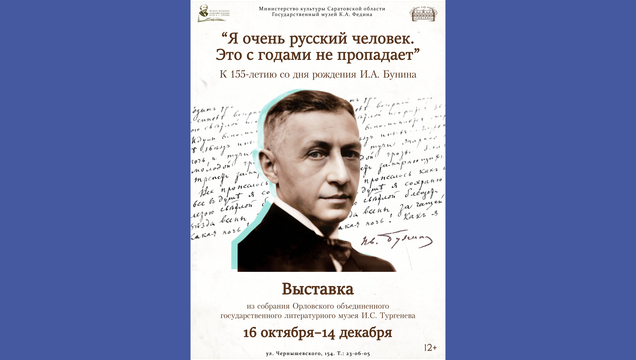 С 17 октября по 14 декабря в Государственном музее К. А. Федина будет работать выставка, посвящённая Ивану Алексеевичу Бунину «Я очень русский человек. Это с годами не пропадает» из собрания Орловского объединённого государственного литературного музея И.С. Тургенева.