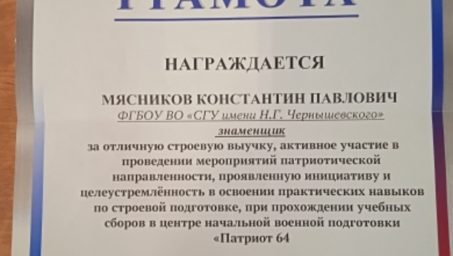 По результатам выполнения поставленных задач при прохождении учебных сборов Михеев Матвей, Мясников Константин, Якимов Егор, Шалабай Константин и Калимов Алихан награждены Грамотами за отличные показатели по военным дисциплинам, по основам БПЛА, по огневой подготовке, строевой выучке и активному участию в проведении мероприятий патриотической направленности.