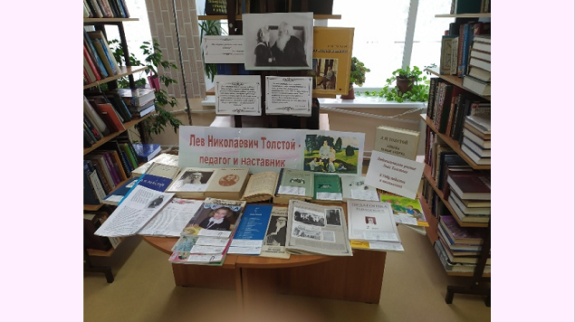 У книжной выставки «Лев Николаевич Толстой – педагог и наставник» внимание будущих учителей было обращено не только на педагогические труды Толстого, издания «Азбуки» и «Новой азбуки», но и на литературу о писателе как о педагоге. Виртуальная выставка «Вечно современный Лев Толстой», размещённая на сайте библиотеки, также была рекомендована присутствующим в качестве дополнительной информации по теме встречи.