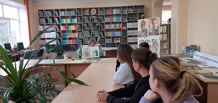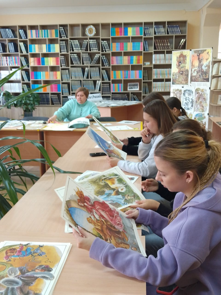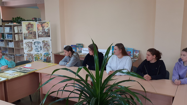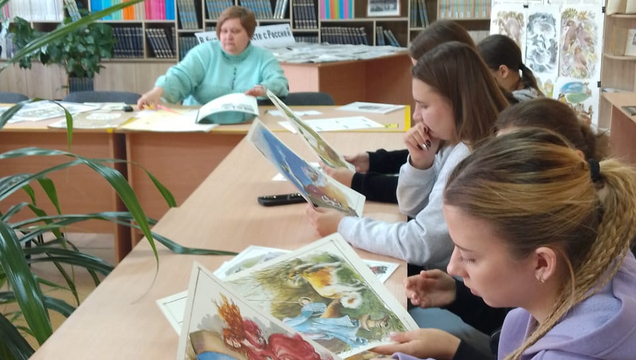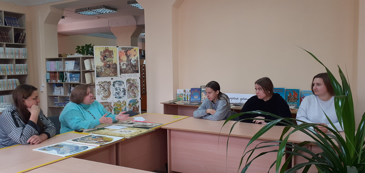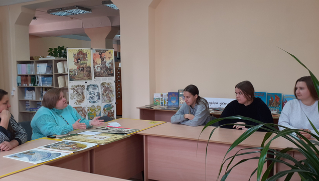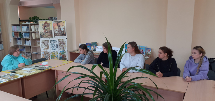 Студенты обсудили развитие детской книги в России и мире, проследили эволюцию детской книги от первых изданий до современных образцов, различные виды и форматы детской литературы, включая книжки-игрушки, книги-перевертыши, комиксы и издания со встроенными элементами, подчеркнув их методические возможности и дидактическую ценность. Особое внимание было уделено работе Я. А. Коменского «Мир чувственных вещей в картинках», ставшей одним из первых примеров использования иллюстраций для обучения и познания мира детьми. Важным тезисом беседы стало признание иллюстрации не просто дополнением к тексту, но и полноценным средством передачи информации, способным самостоятельно раскрывать сюжет, характеры персонажей и атмосферу произведения. Особое место в дискуссии занял обзор творчества художников-иллюстраторов, внесших неоценимый вклад в развитие детской книги: Ивана Билибина, Ольги Сосневской, Ирины Дзевель, Татьяны Капустиной, Анатолия Елисеева.