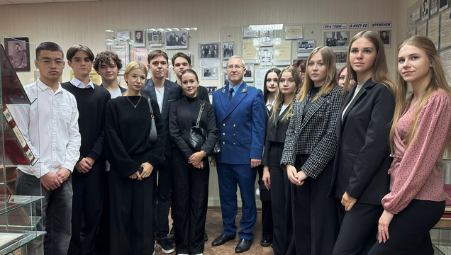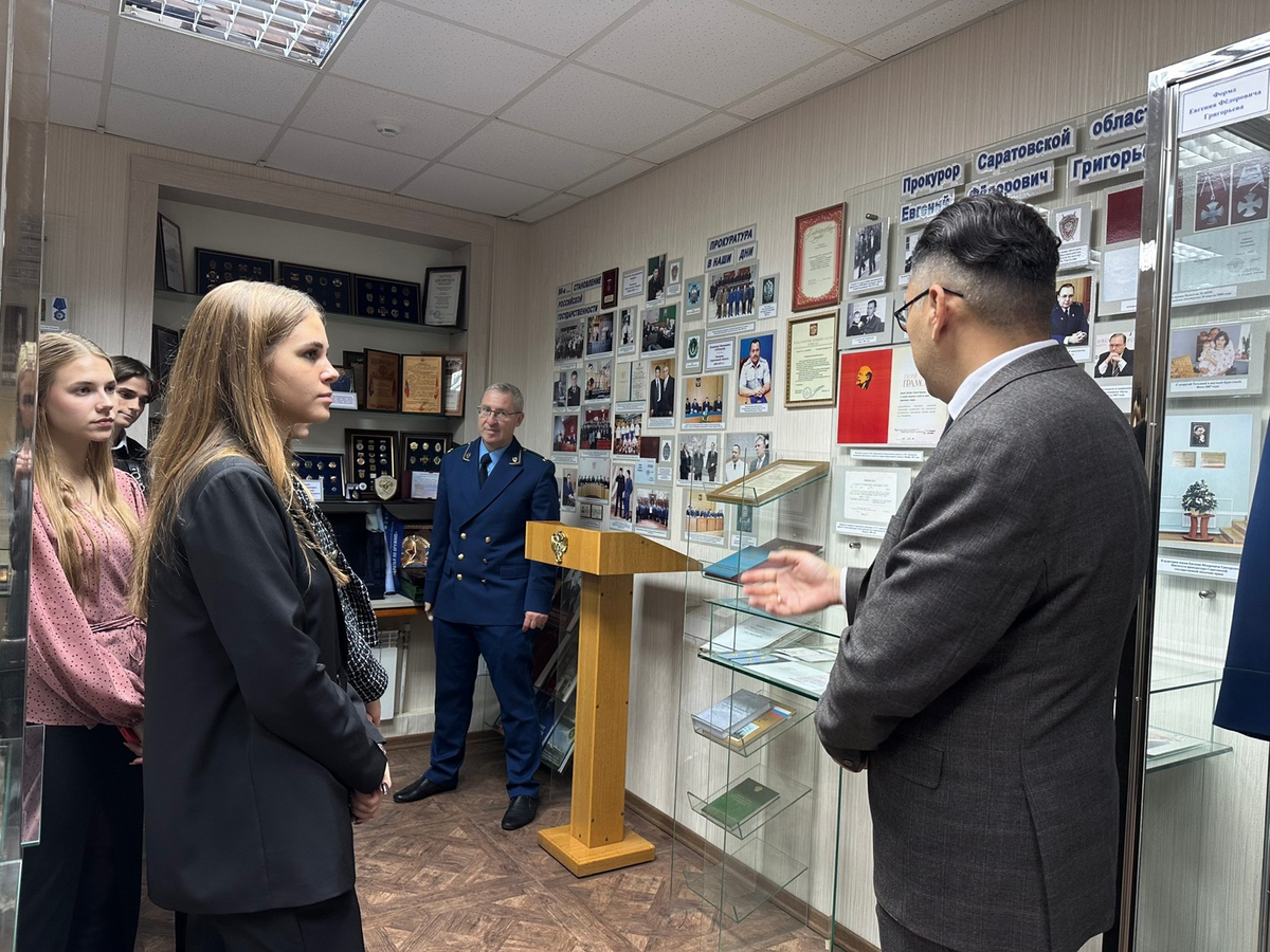 22 октября 2025 года студенты 1 курса 191 группы специальности 40.05.04 «Судебная и прокурорская деятельность» вместе со старшим преподавателем кафедры теории государства и права Чулисовой Юлией Александровной посетили музей прокуратуры Саратовской области. Экскурсию по музею прокуратуры студентам провел Александр Николаевич Иванов – старший прокурор учебно-методического отдела прокуратуры Саратовской области – межрегионального центра профессионального обучения прокурорских работников и федеральных государственных гражданских служащих, советник юстиции, к.ю.н., доцент.