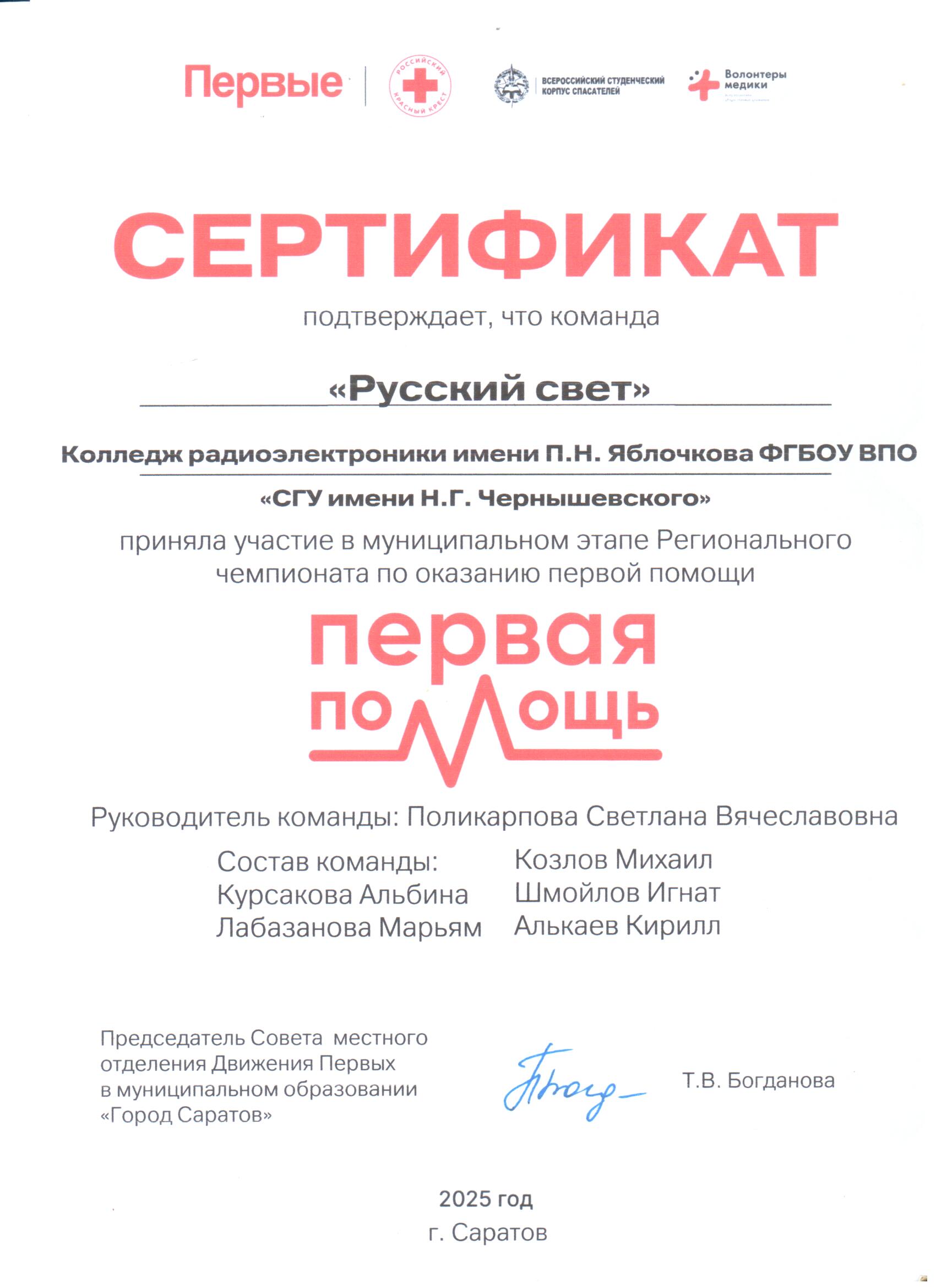 16 октября 2025 года команда Колледжа радиоэлектроники имени П.Н.Яблочкова «Русский свет» приняла участие в муниципальном этапе Всероссийского проекта «Первая помощь». Это один из флагманских проектов Движения Первых.