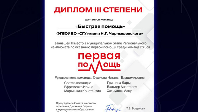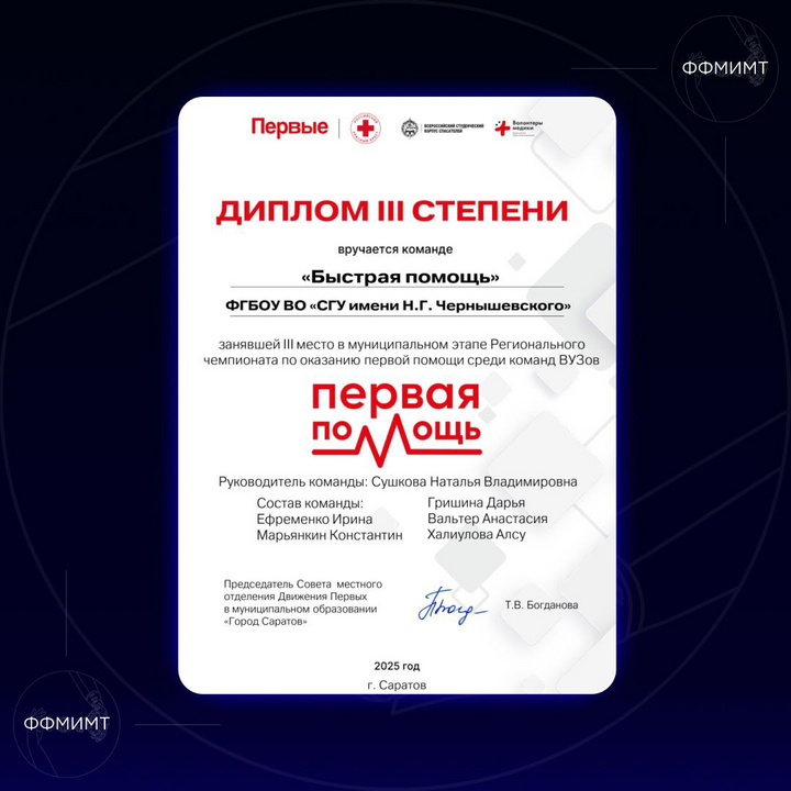 24 октября 2025 года две команды факультета фундаментальной медицины и медицинских технологий под руководством Сушковой Натальи Владимировны и Голядкиной Анастасии Александровны приняли участие в муниципальном этапе Регионального чемпионата по оказанию первой помощи.