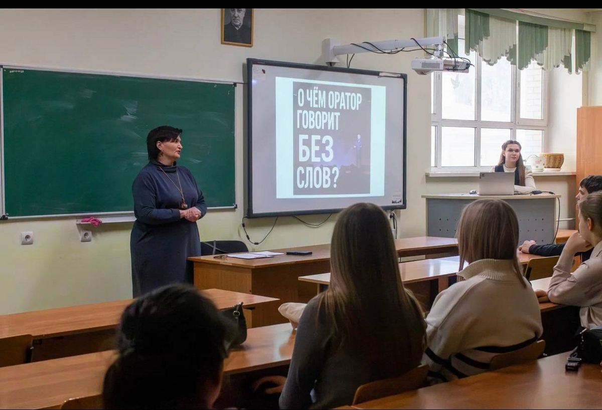 Первое занятие по основам речевой культуры провели доцент кафедры начального языкового и литературного образования Н.А. Шабанова и ассистент той же кафедры Д.И. Крылова на тему «О чём оратор говорит без слов?». Ребята познакомились с основами невербального общения и узнали, как жесты, мимика, поза и интонация влияют на восприятие речи.
