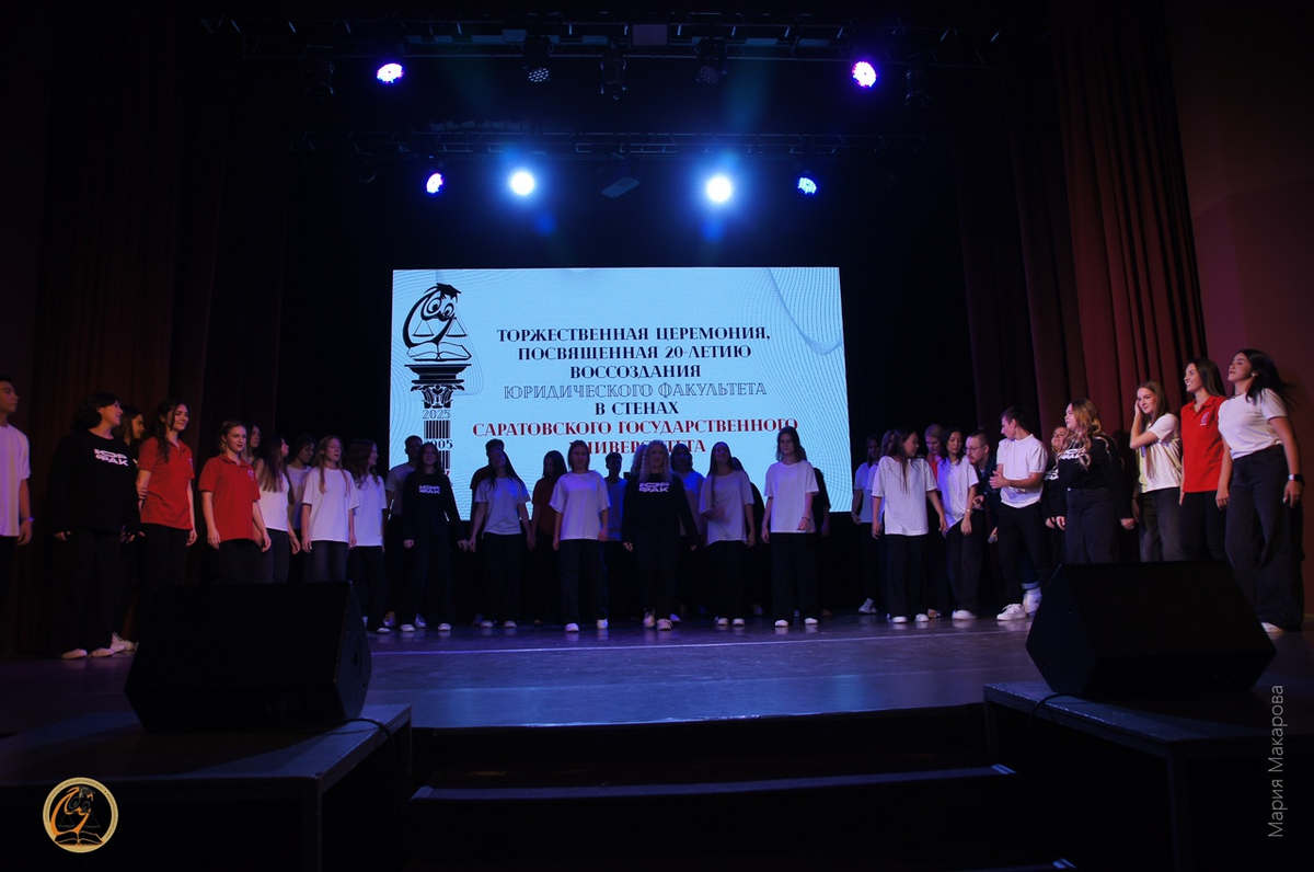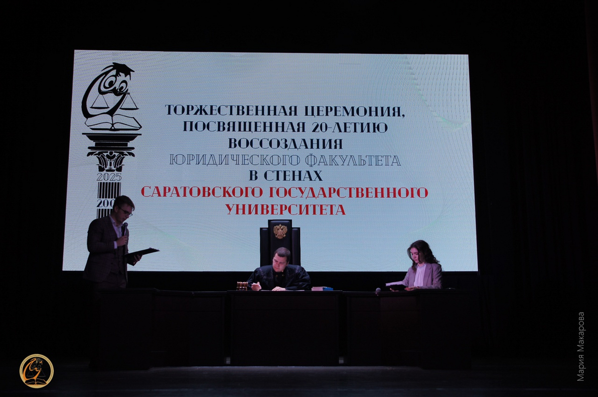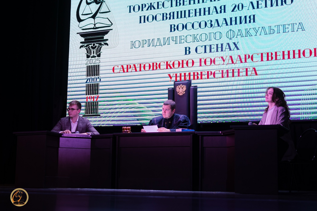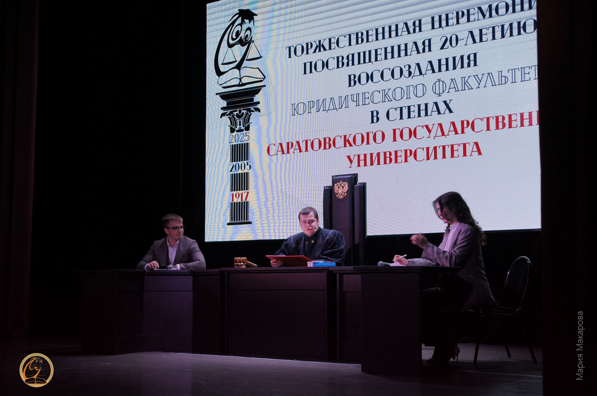 14 октября 2025 года в актовом зале Х корпуса состоялась Торжественная церемония, посвященная 20-летию воссоздания юридического факультета в стенах СГУ им. Н.Г. Чернышевского. Зрители стали свидетелями уникального судебного процесса по делу № 20: Время против Юридического факультета.