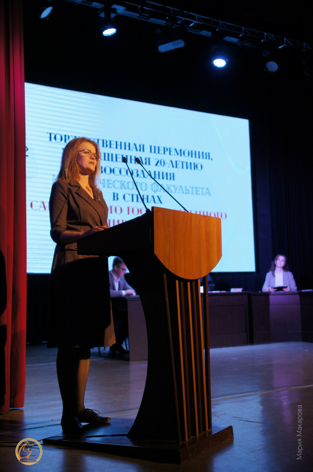 Поздравить юридический факультет с круглой датой получилось не только у присутствующих в зале – тёплые пожелания и самые душевные слова с помощью видео с разных уголков мира передали Пилия Диана Эдуардовна – Председатель Конституционного суда Республики Абхазия, кандидат юридических наук; Бабурин Сергей Николаевич – Президент Ассоциации юридических вузов, доктор юридических наук; Данилов Михаил Викторович - Исполняющий обязанности ректора Северного (Арктического) федерального университета имени М.В.Ломоносова, доктор политических наук; Василевич Григорий Алексеевич – Заведующий кафедрой конституционного права юридического факультета Белорусского государственного университета, доктор юридических наук, профессор, Заслуженный юрист Республики Беларусь, а также выпускники юридического факультета прошлых лет.