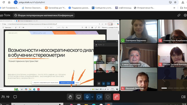 В докладе было представлено определение неосократического диалога, рассмотрены принципы неосократического диалога, отличия проблемного диалога от неосократического диалога, особенности составления вопросов для неосократичского диалога, представлен пример решения стереометрической задачи с использованием неосократического диалога. Выступление является продолжением исследования, начатого во время участия в Большой математической мастерской в г. Санкт-Петербурге. Работа творческой группы студентов и преподавателей из г. Москва, г. Санкт-Петербурга, г. Балашова продолжается, в ближайшее время планируется провести апробацию исследования.
