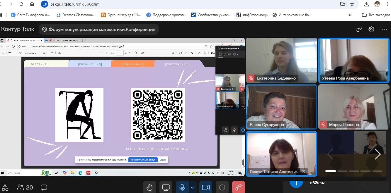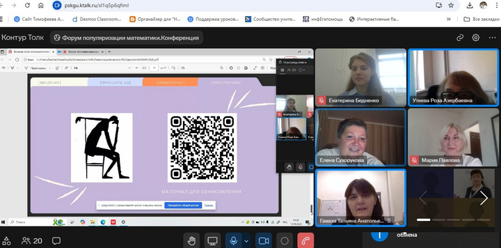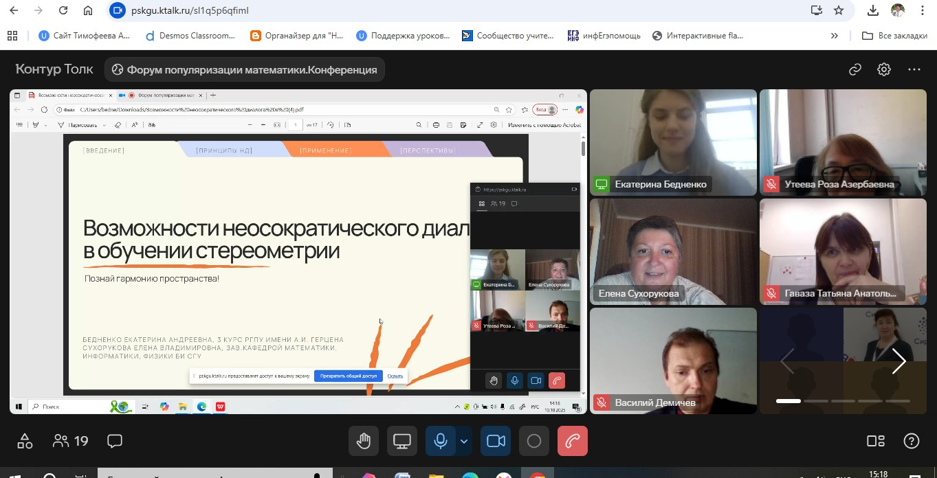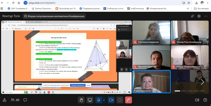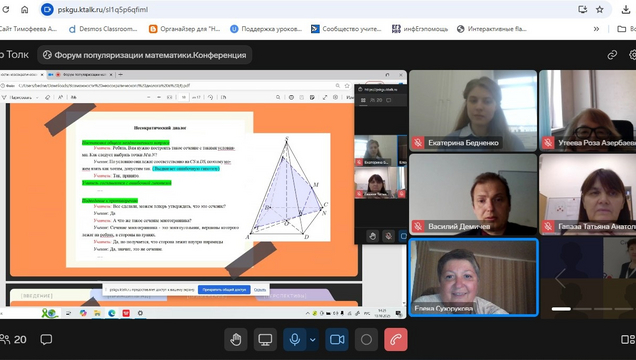 В конце прошлой недели в г. Псков на базе ФГБОУ ВО «Псковский государственный университет» проходил «Форум популяризации математики и физико-математического образования». В рамках форума работала Всероссийская научно-методическая конференция «Физико-математическое и ИТ-образование в современном обществе: проблемы, пути решения, перспективы развития». В работе конференции приняла участие заведующая кафедрой математики, информатики, физики Е.В. Сухорукова. Елена Владимировна выступила на Панельной дискуссии «Совершенствование школьного и вузовского физико-математического образования, популяризация математики» с докладом «Возможности неосократического диалога в обучении стереометрии».