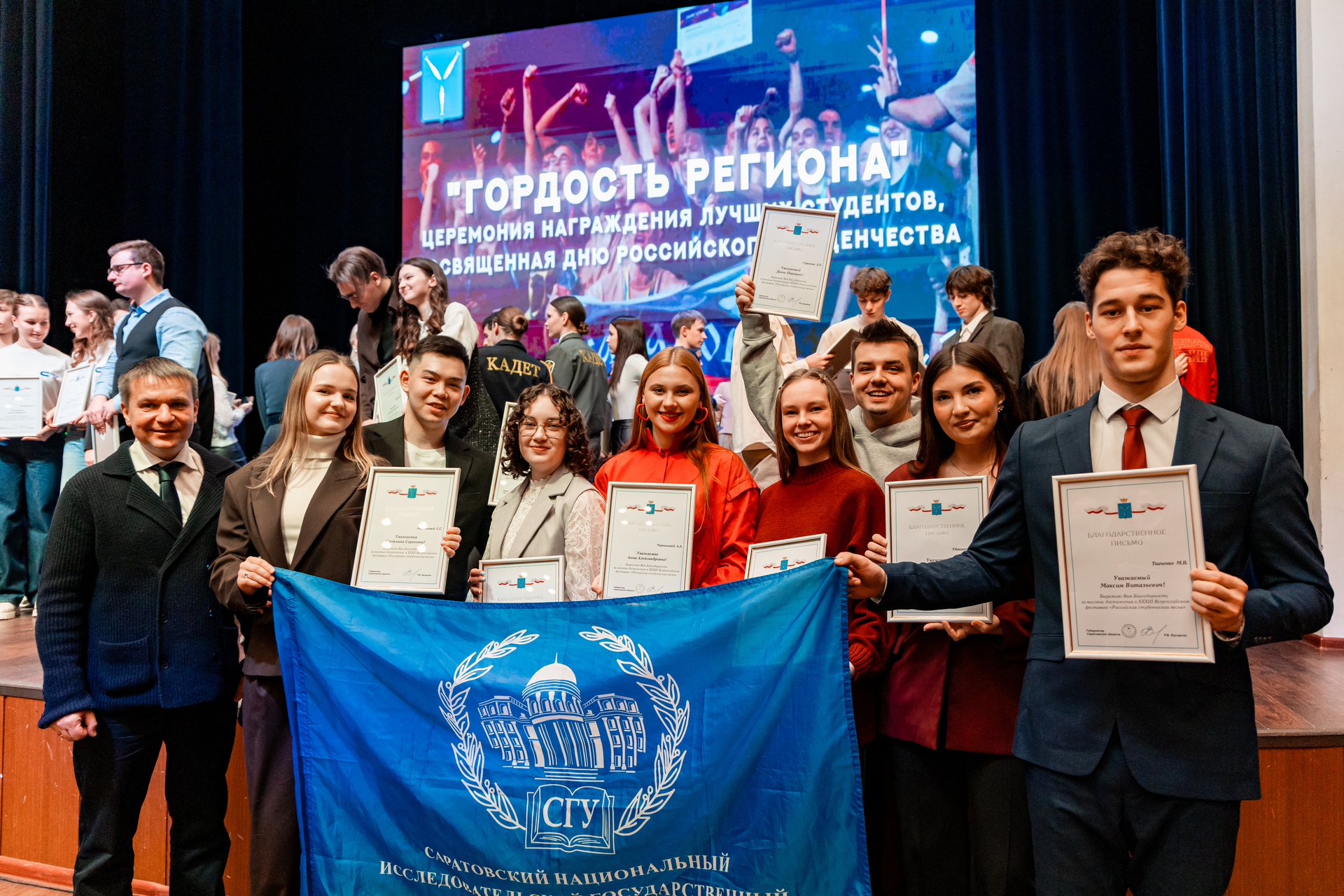 Ко Дню российского студенчества 13 активистам Саратовского университета торжественно вручили благодарственные письма Губернатора Р.В. Бусаргина. Награждение победителей Российской студенческой весны и различных спортивных соревнований состоялось в Поволжском институте управления имени П.А. Столыпина. Делегацию СГУ на церемонии возглавил проректор по молодёжной политике и воспитательной работе А.В. Головченко.