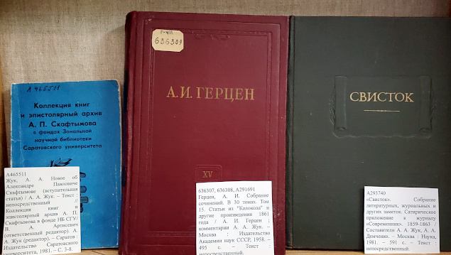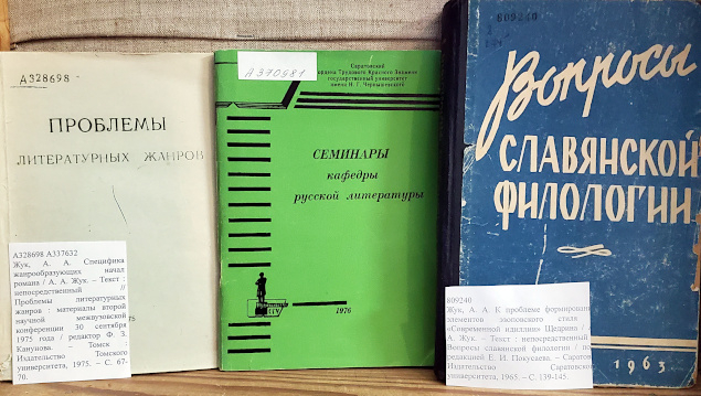 Основу выставки составили монографии о «Современной идиллии» Салтыкова-Щедрина, о сатире натуральной школы, о русской прозе XIX века; подготовленные ею отдельные тома полного собрания сочинений А. И. Герцена и М. Е. Салтыкова-Щедрина, издание «Свистка» - сатирического приложения к журналу «Современник» - в серии «Литературные памятники», сборник литературно-критических работ Н. Г. Чернышевского с подготовкой текста и примечаниями профессора А. А. Жук.