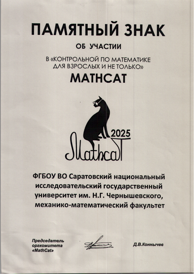 Организационный комитет 12-го Всероссийского математического флешмоба «Контрольная по математике для взрослых и не только "MathCat"» выразил благодарность сотрудникам СГУ за организацию акции на площадке вуза. Университету также присвоен памятный знак об участии. Математический флешмоб прошёл 29 ноября 2025 года на базе СГУ.