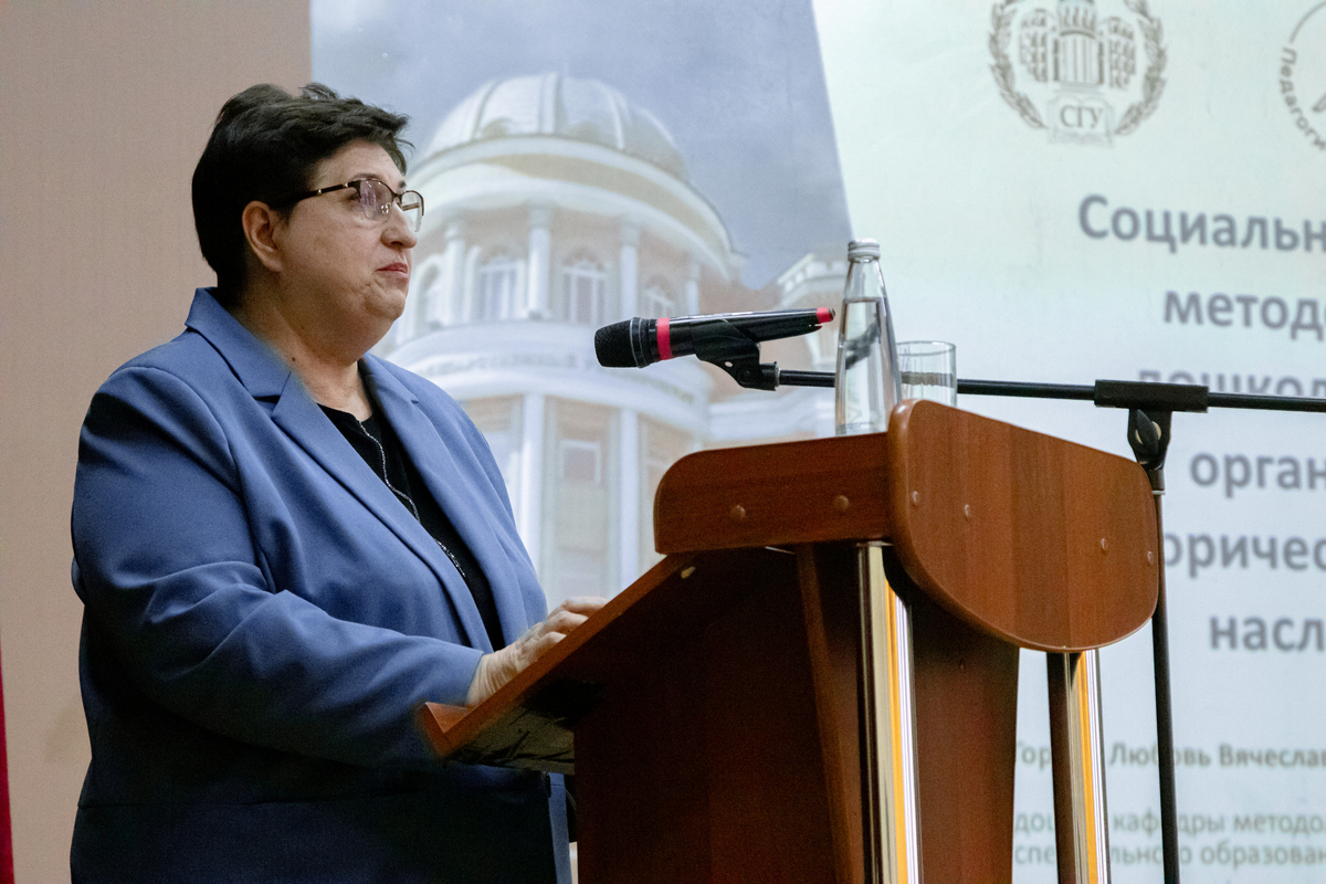 Доцент кафедры методологии образования Л.В. Горина рассказала о партнёрских отношениях кафедры и дошкольных образовательных организаций. Коллеги проводят мероприятия по сохранению исторической памяти и культурного наследия народов России среди ребят дошкольного возраста.