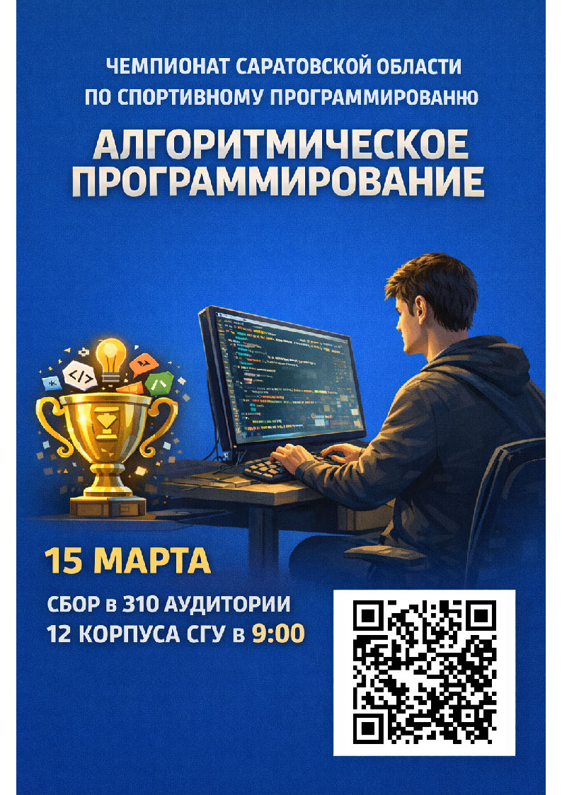 Студенты могут принять участие в соревнованиях по алгоритмическому программированию. Состязание пройдёт 15 марта в рамках чемпионата Саратовской области по спортивному программированию.