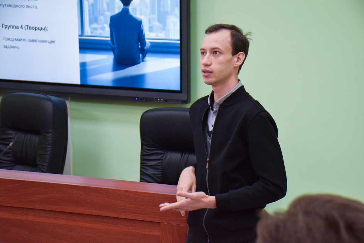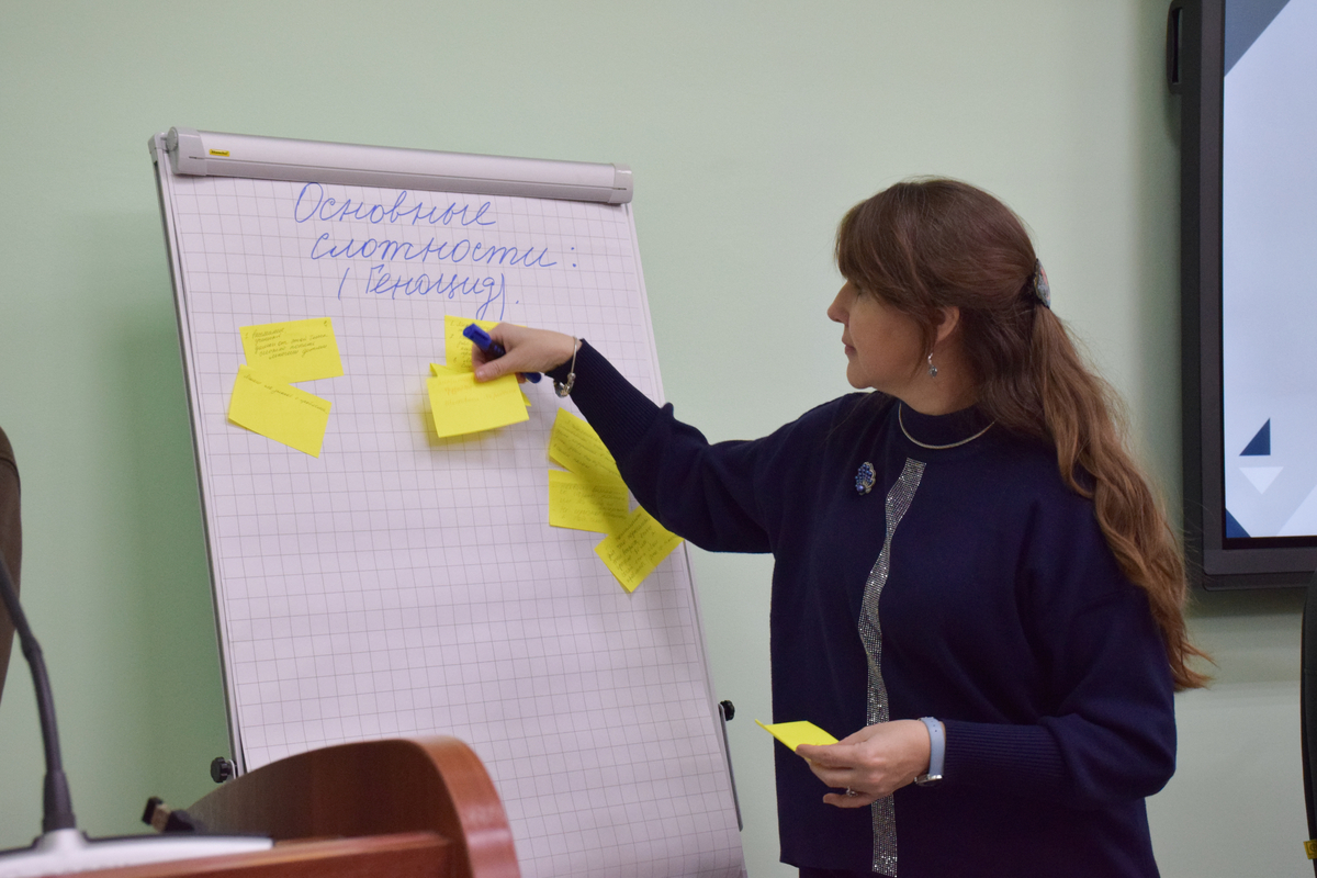 Далее доценты кафедры психологии образования Института педагогики и психологии Н.Г. Молодцова и И.А. Горбенко провели мастер-класс «Ресурсы и инструменты для проведения киноурока по тематике проекта "Без срока давности"». Вместе с собравшимися в аудитории Наталья Геннадьевна выявила вызовы, с которыми сталкиваются педагоги при обсуждении на школьных уроках темы геноцида мирных людей в Великую Отечественную войну. Среди проблем – эмоциональные барьеры, когнитивные сложности, информационный шум и риск моральной травматизации.